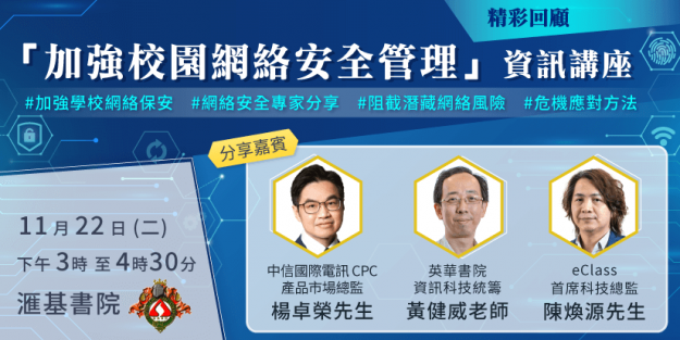 精彩回顧: 「加強校園網絡安全管理」資訊講座 日期︰2022 年11 月 22 日 是次資訊講座邀請了不同界別…