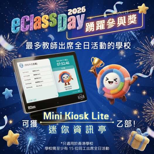 1. 學校需至少有15位同工出席全日活動。2. 獎項只適用於香港學校。3. eClass 將於活動完結後通知得獎學校有關獎品的發放安排。4. 如有任何爭議,本公司保留最終決定權。