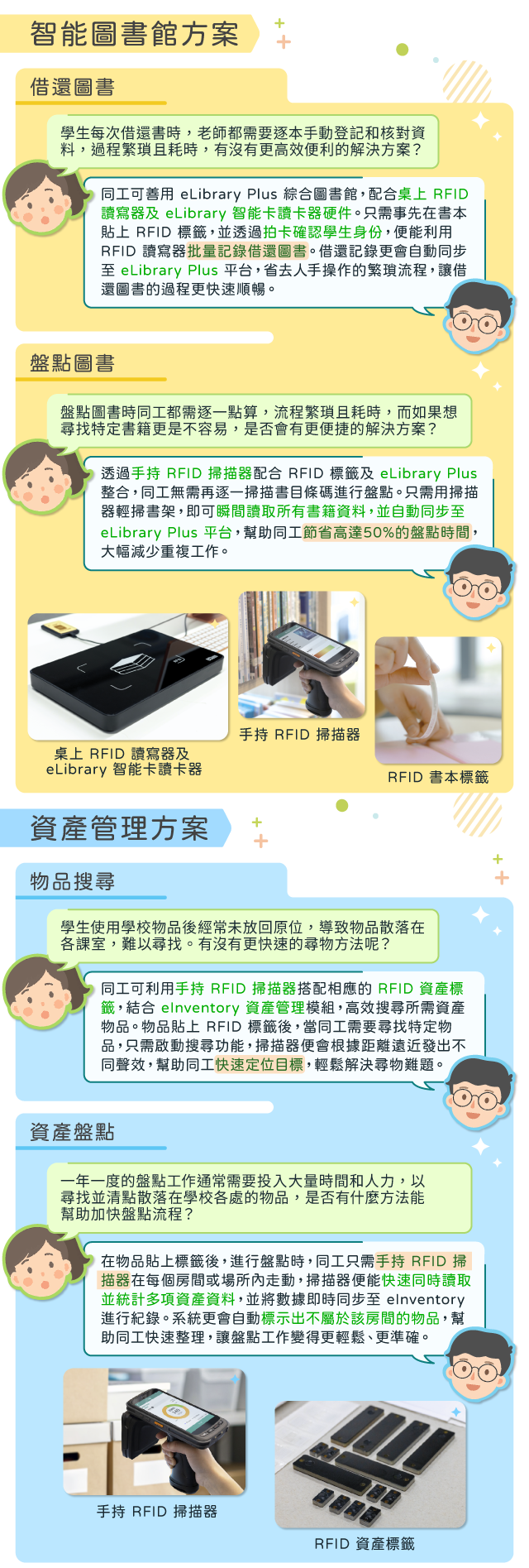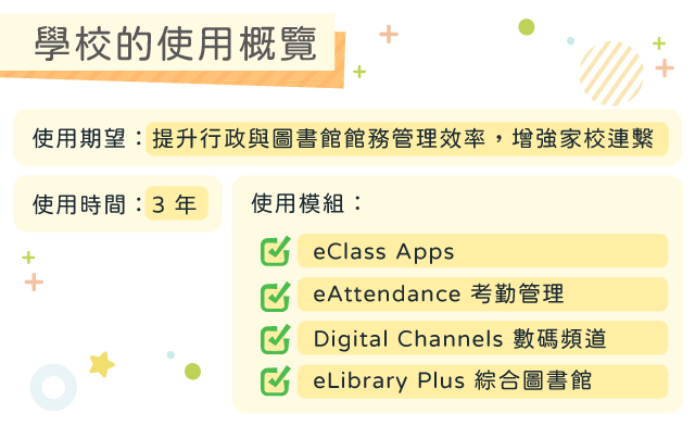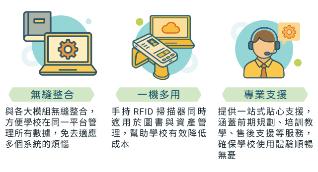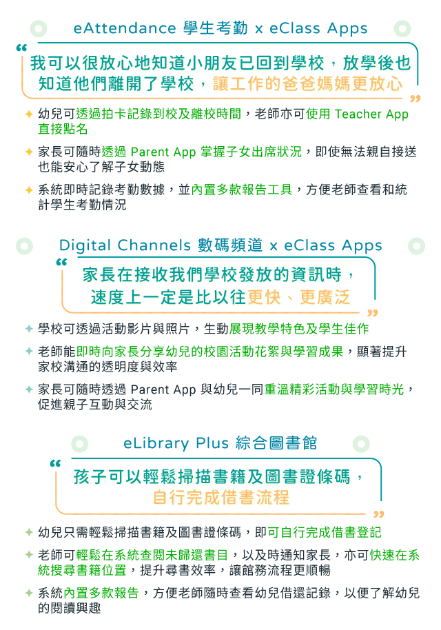新學年漸入軌道,正是探索如何運用科技進一步提升校務效率的好時機。eClass 服務香港幼稚園超過十年,深知幼稚園同工的需要。為此,我們特別在本期的「幼稚園綜合服務 (KIS) 11 月焦點」與您分享聖公會聖三一堂曾肇添幼稚園的實踐經驗,了解他們如何善用 eClass 服務建立數碼校園,希望能為同工提供參考和啟發,探索如何善用各個模組提升日常行政效率。另外,我們亦會介紹如何透過 RFID 硬件設備,進一步提升圖書館與資產管理效能,減輕同工的校務負擔。 聖公會聖三一堂曾肇添幼稚園近年引入多個 eClass 模組服務,積極推動校園數碼化以優化學校日常運作。目前,學校在行政管理、家校溝通及簡化圖書館館務等方面已取得很大成效,就讓我們一同了解「曾肇添幼稚園」的實踐經驗吧! 善用 RFID 硬件配套 全面簡化圖書館館務與資產管理流程 正如曾肇添幼稚園的經驗所示,善用電子行政服務是提升管理效率的關鍵,而合適的硬件配置同樣不可或缺。為此,eClass 特別提供多款 RFID 硬件設備,並與 eLibrary Plus 綜合圖書館及 eInventory 資產管理模組整合,協助學校簡化圖書館及資產管理流程,進一步提升整體管理效能。 為何選用 eClass 硬件方案? eClass 網站|聯絡我們 © 2025 eClass Limited 取消接收電子報 取消接收電子報 Share on FacebookShare on Facebook Share on WhatsAppShare on WhatsApp